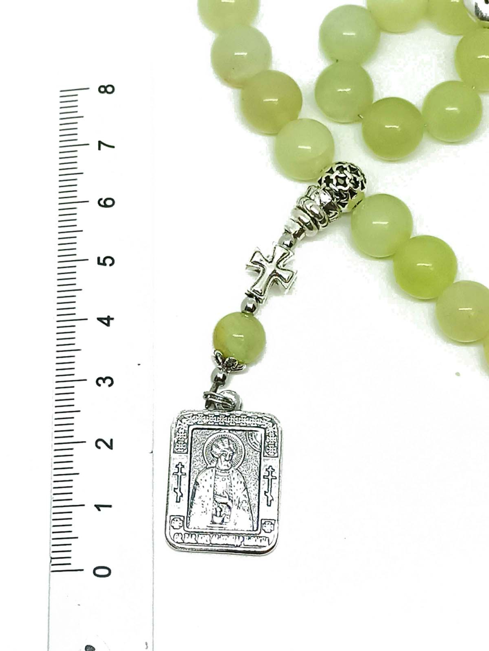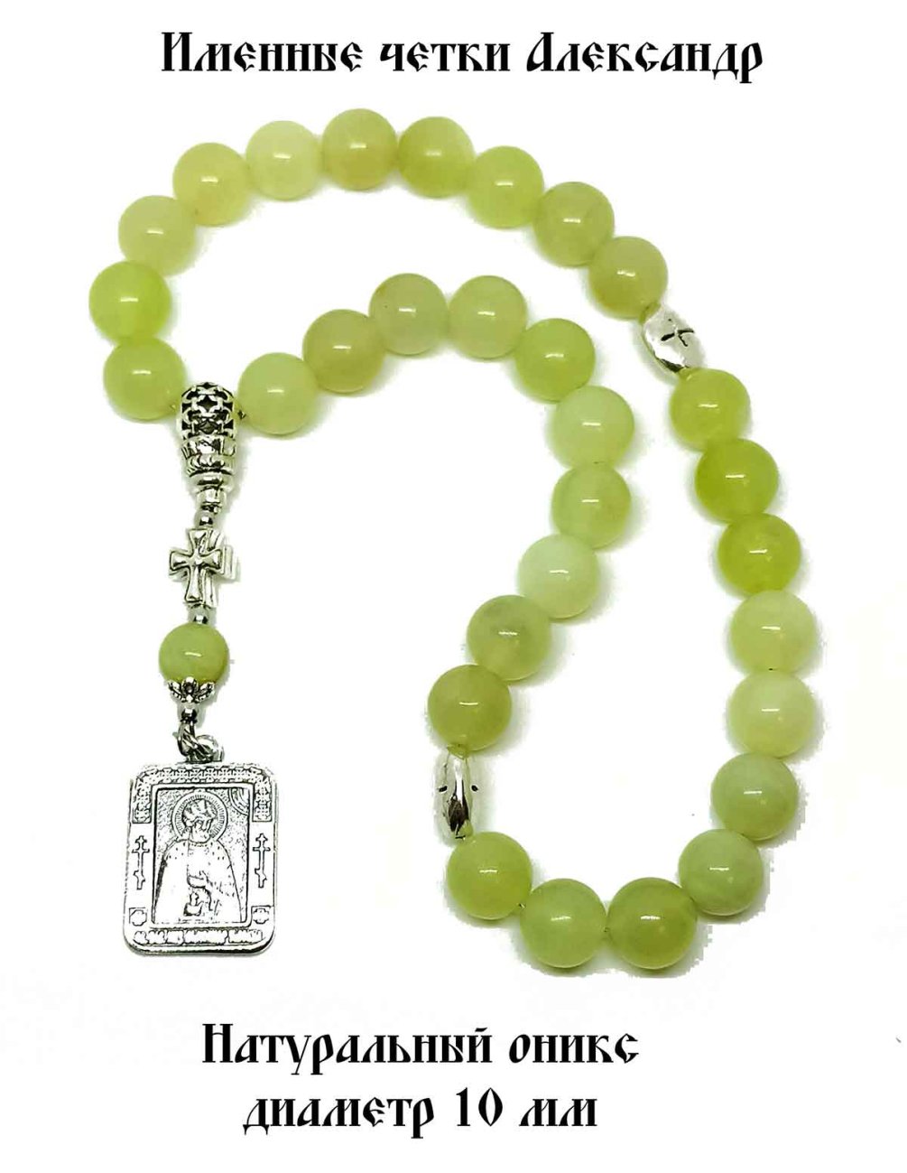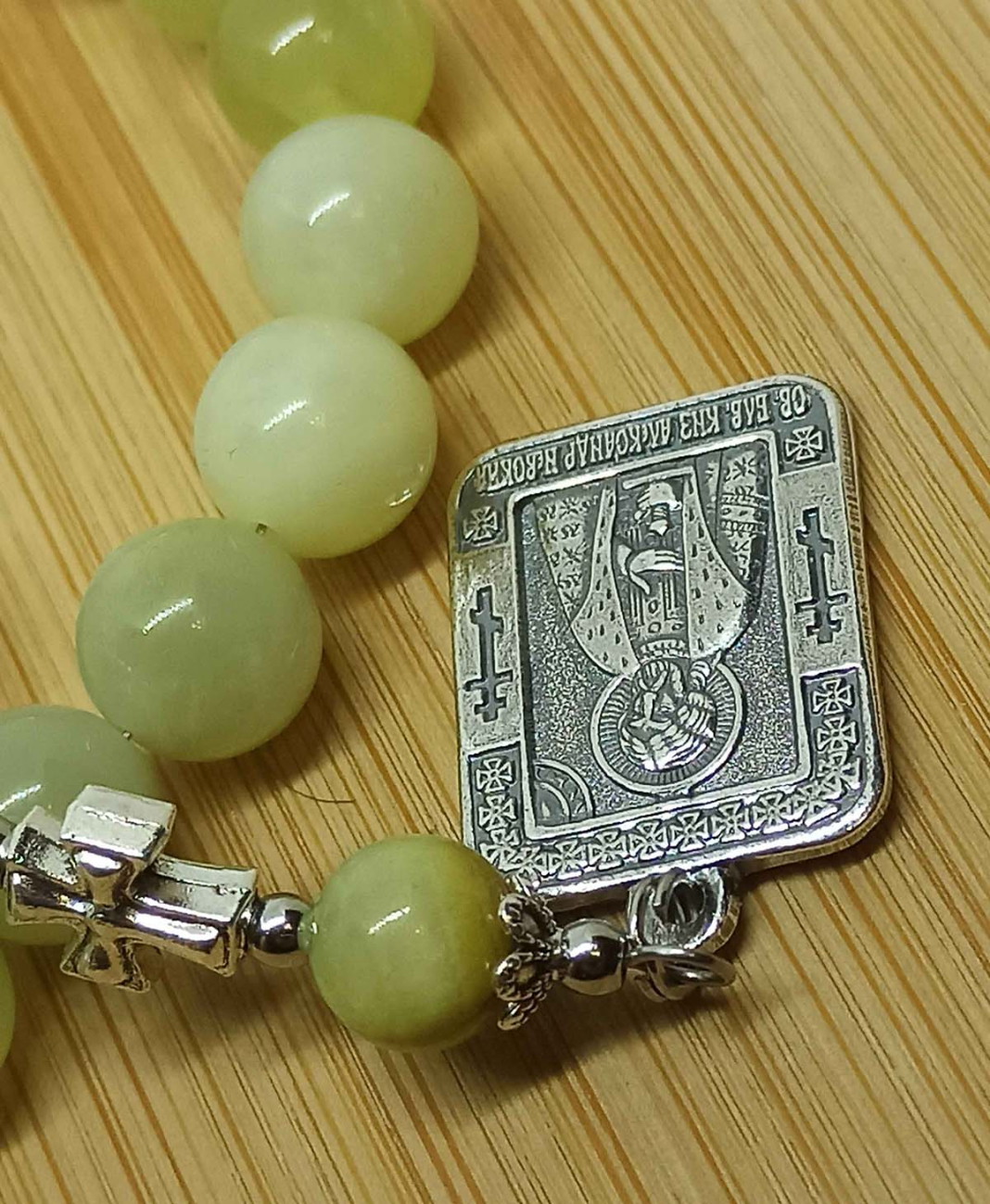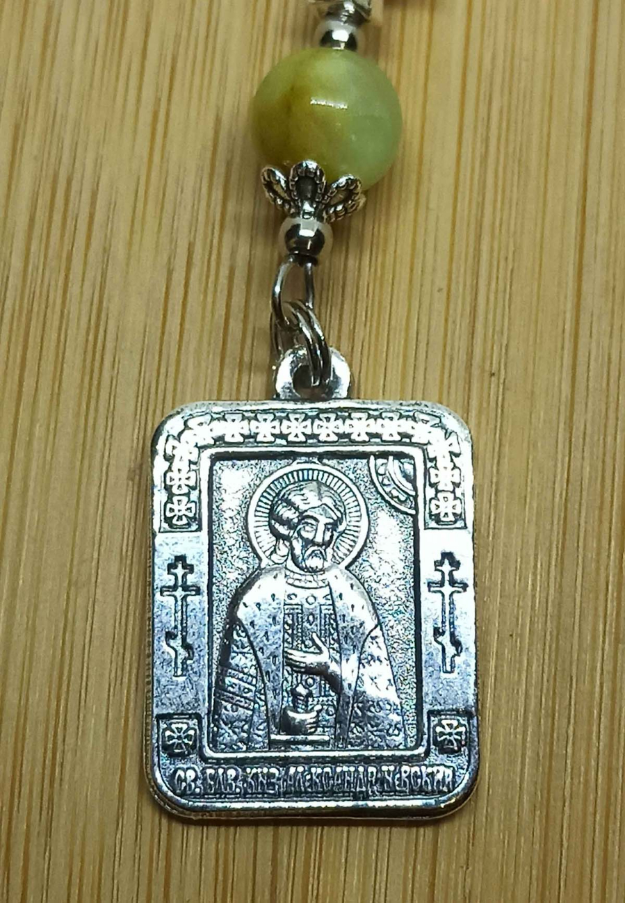 Основа композиции четок - крестик и иконка с ликом святого благоверного князя Александра Невского, на обратной стороне Ангел-Хранитель. Сочетание яркого камня и фурнитуры под античное серебро очень гармонично.