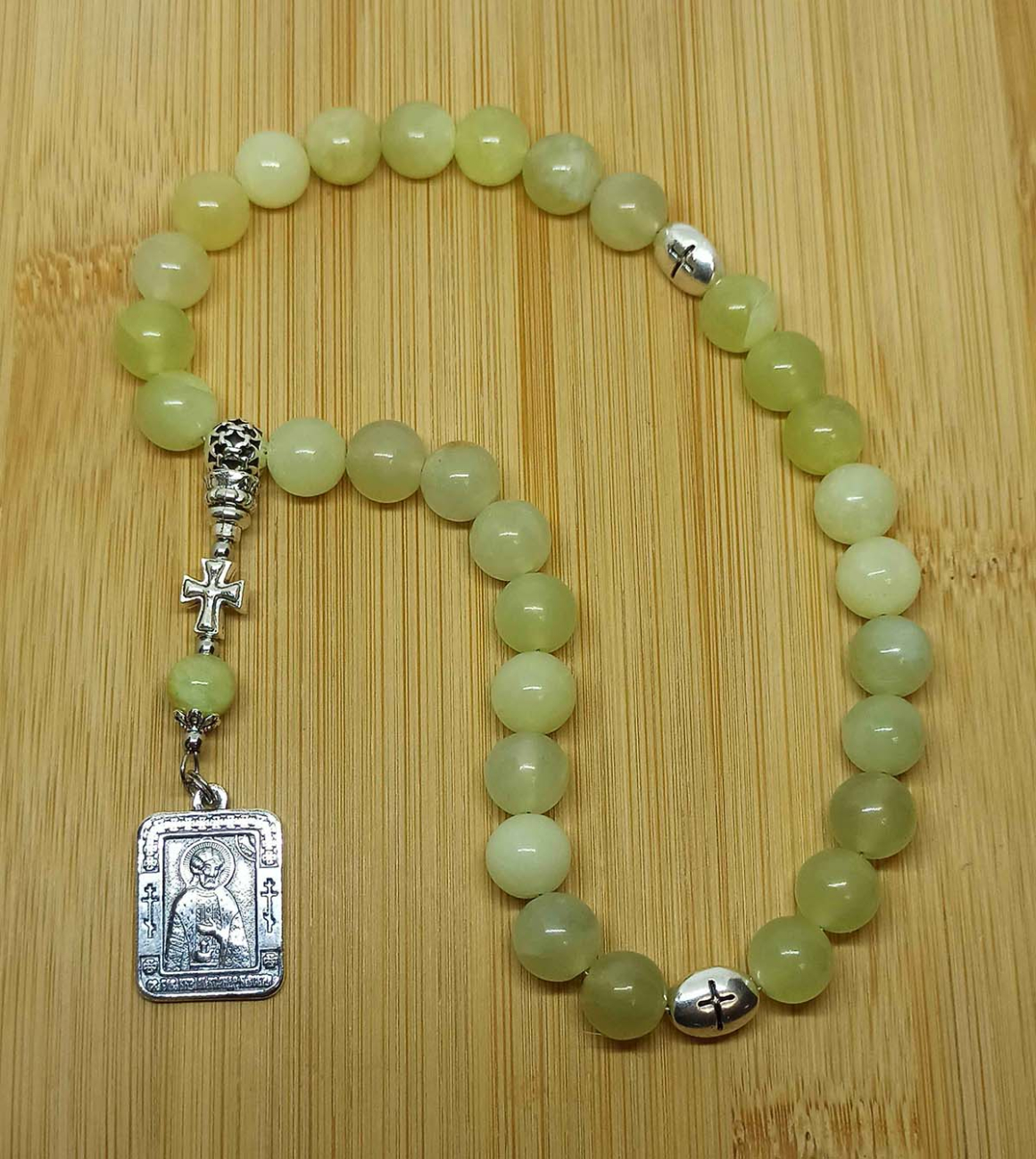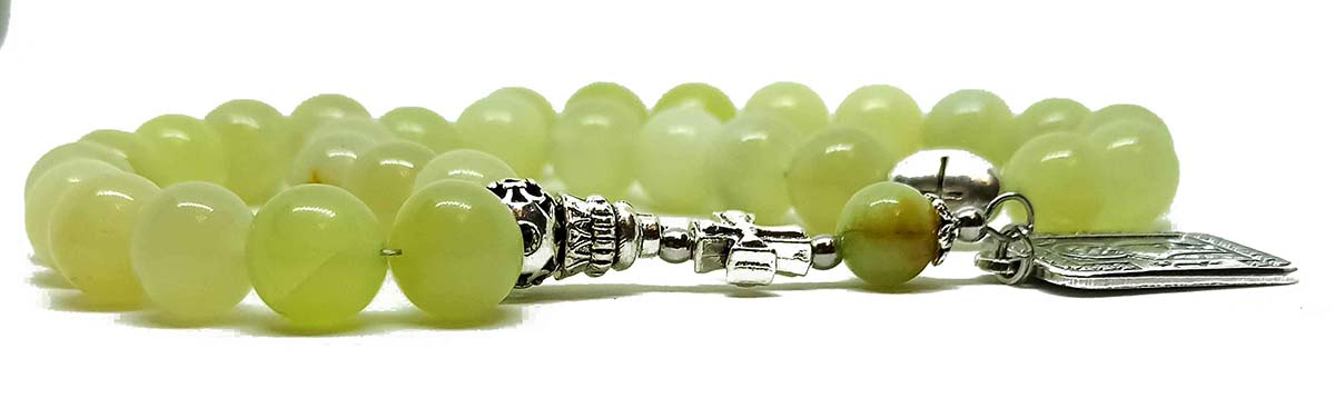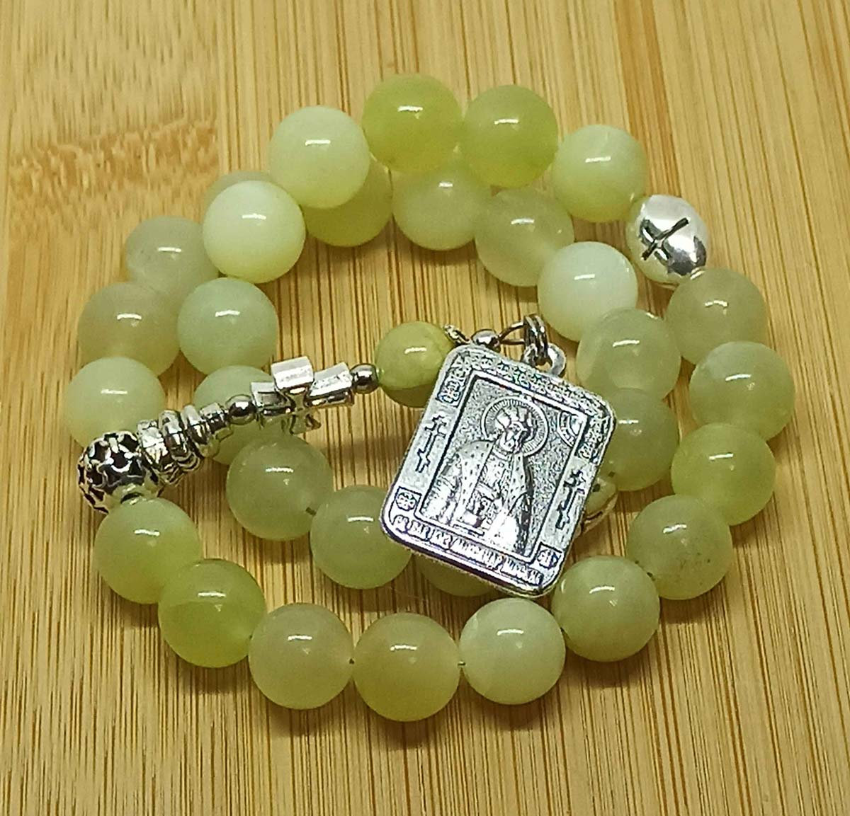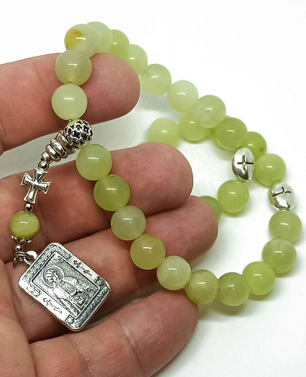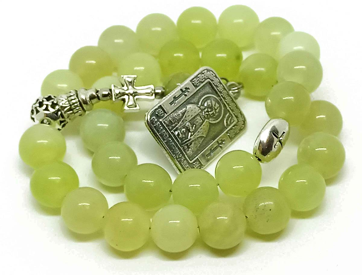 Основа композиции четок - крестик и иконка с ликом святого благоверного князя Александра Невского, на обратной стороне Ангел-Хранитель. Сочетание яркого камня и фурнитуры под античное серебро очень гармонично.